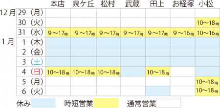 年末年始営業時間につきまして下記の通りご案内いたします。
